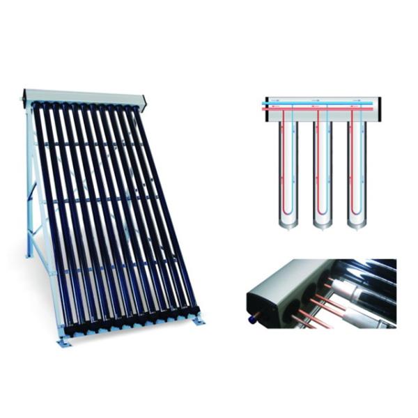 In each vacuum tube there is a U pipe with direct flow-through that is connected to the header pipe inside manifold. This U pipe is seamed in an aluminum heat transfer fin in the interior of vacuum tube that transmits the heat FROM the interior tube to the U pipe.